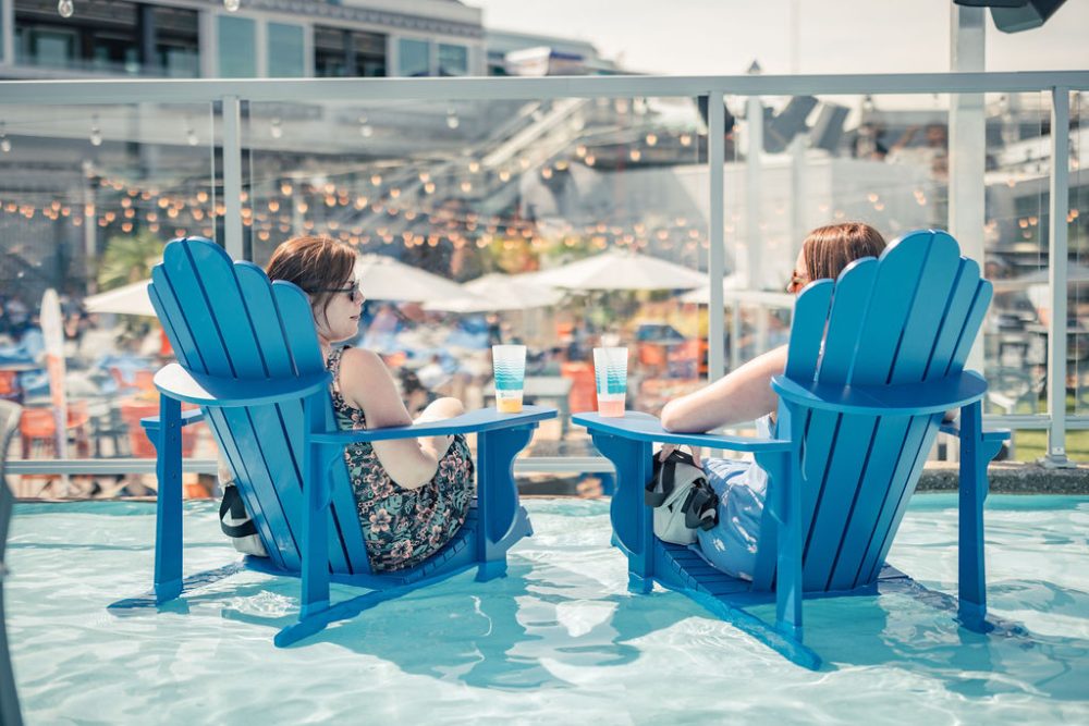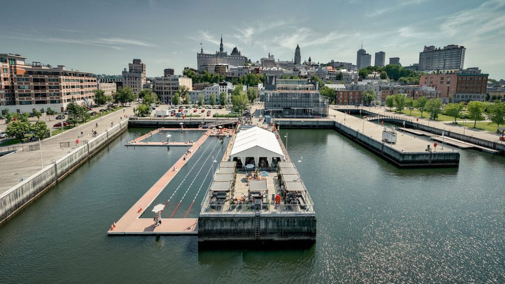 The Port of Québec Oasis is a riverside relaxation area and free summer facility where visitors can read, unwind, and socialize while enjoying the views of the Marina. North America’s first port swimming space offers easy, free, and soothing access to the river, with Olympic-length swimming lanes.