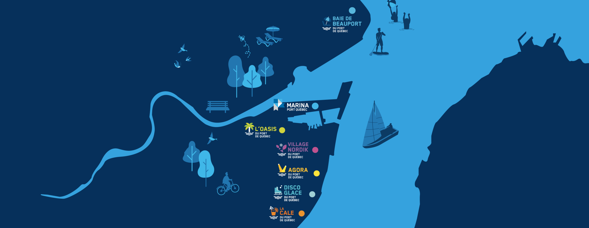 L’Agora, L’Oasis, la Baie de Beauport, La Cale, la Discoglace, la Marina, and le Village Nordik all offer the public unique ways to experience the river, as well as the chance to relax, explore, and observe port life in all seasons